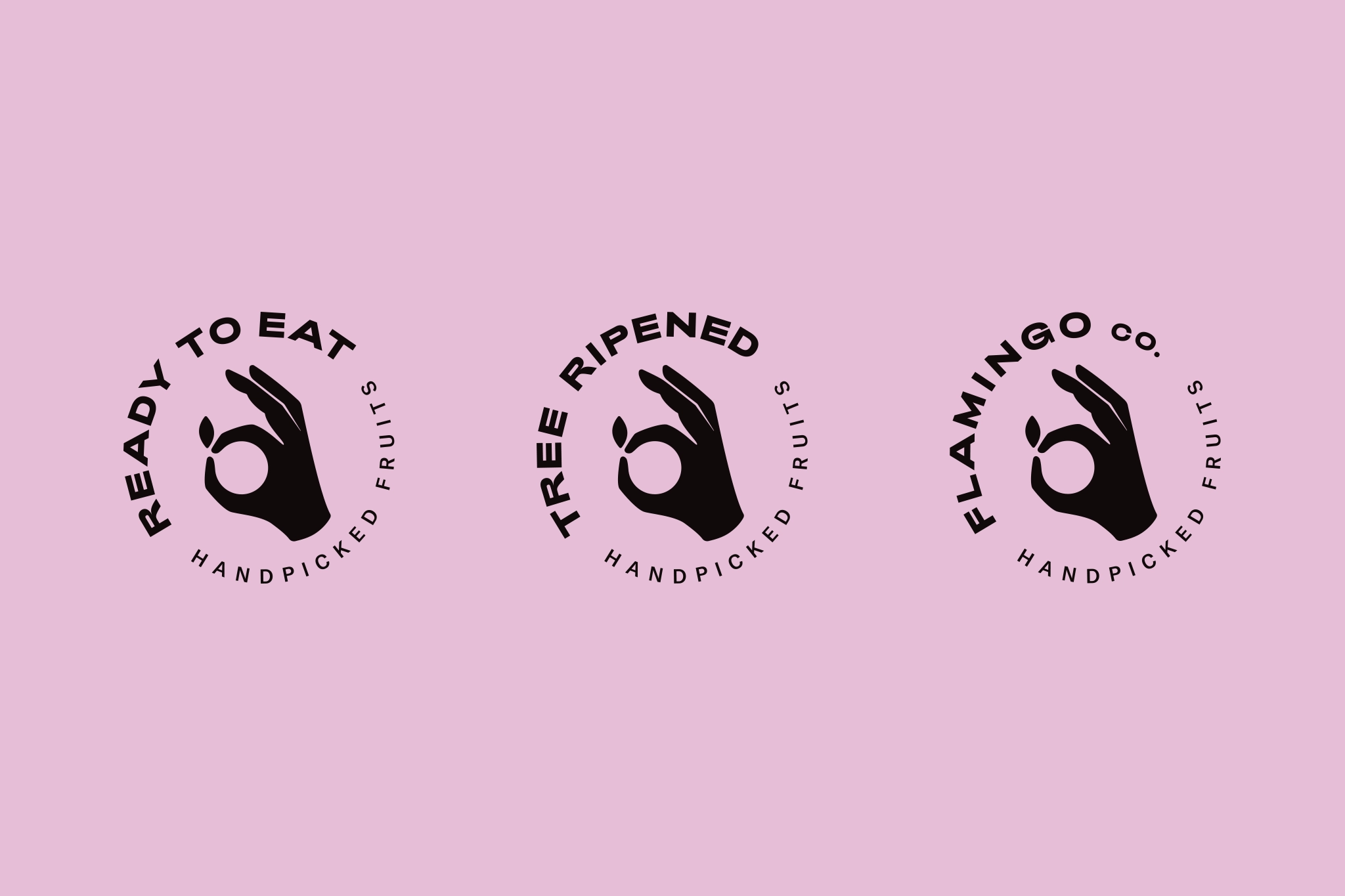 To contrast the soft pink palette, I selected a bold, characteristic font for headings paired with a clean sans-serif typeface for body text, incorporating diamond shapes to nod to vintage fruit companies while delivering a modern twist. The design emphasizes the ripeness, juiciness, and field-fresh quality of each fruit, honoring the labor and dedication involved. Central to this is the new hand symbol—depicting a hand with negative space forming a fruit shape—serving as the trademark, quality seal, and versatile stickers. The symbol remains consistent, but surrounding text varies for "ready to eat" and "tree-ripened" labels, reinforcing authenticity and superior taste.